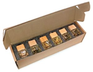 Коробки для ложементов были выбраны заказчиком. Учитывая размеры и пропорции коробок, было решено, что в многоуровневом ложементе флаконы будут лежать на свёрнутых верёвках-подвесах (высота коробки позволяла реализовать подобное решение). Так можно было поместить в одну коробку максимум флаконов, и обеспечить их защиту ложементом со всех сторон.